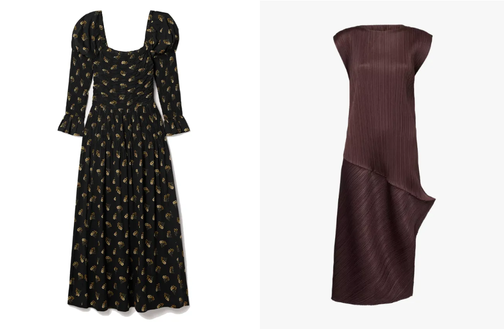 Knitted dresses combine comfort and design. Longer designs with high collars, embellished with pleats or structured necklines, offer warmth without sacrificing style. For fall and winter, pairing a long coat, such as those from Joseph and Staud, creates a soft and elegant look.